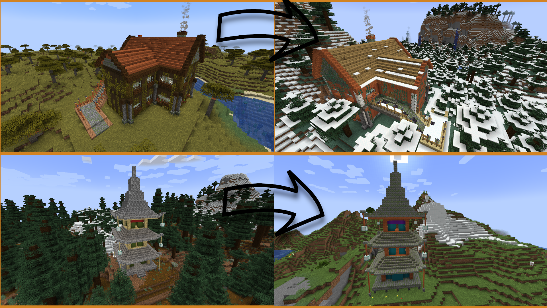 There are many structures that can also have variant materials. E.g. the Watchtower is built from spruce, but a dark oak watchtower could be naturally generated as a new, fresh alternative. Shrines' Random variation feature exchanges the materials of its builds on every placement. You can see a Balloon in white, in red, purple, green etc. Since 3.x.x you're also able to fully configure random variation through datapacks.