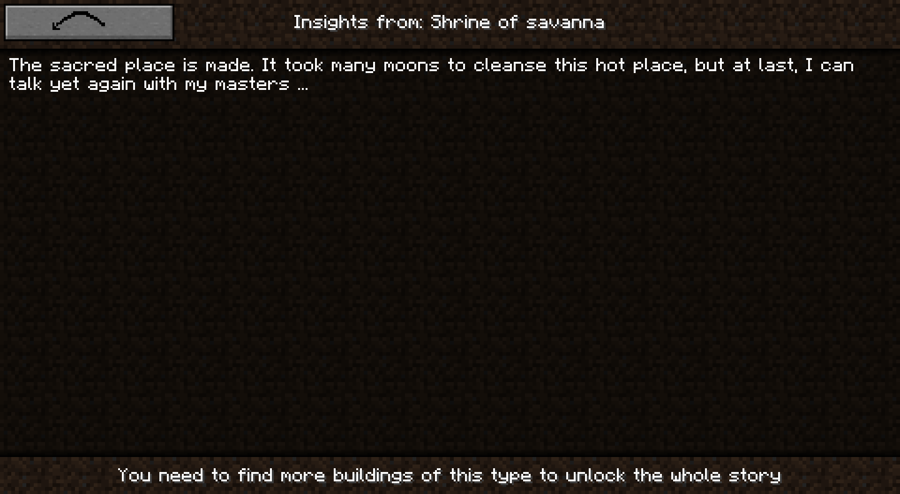 Every structure in this mod is carefully constructed to be both functional and immersive. Each one has its own personality and place in the Minecraft world. You can use Shrines' builds to create your own story, but there are also stories you can uncover in game with this mod. Follow Jon and his family on their adventures as you explore new Shrines structures or traverse the world to find all the old, scrapped pages of his diary.